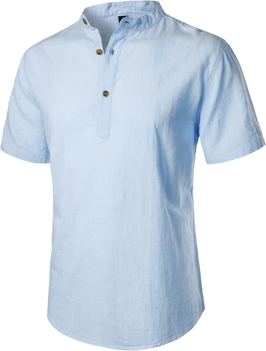 LucMatton Men's Casual Cotton Linen Short Sleeve Henley Shirt Summer Lightweight Banded Collar Beach Tops