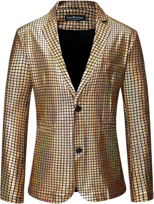 LucMatton Men's Metallic Sequin Suits 2 Piece Disco Sets, Shiny Jacket and Pants for Formal Events, Regular Fit, Long Sleeve, Dry Clean Only