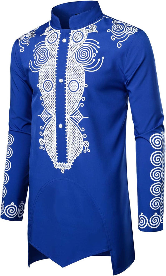 LucMatton Men's Traditional African Long Sleeve Dashiki Shiny Metallic Pattern Printed Party Shirt