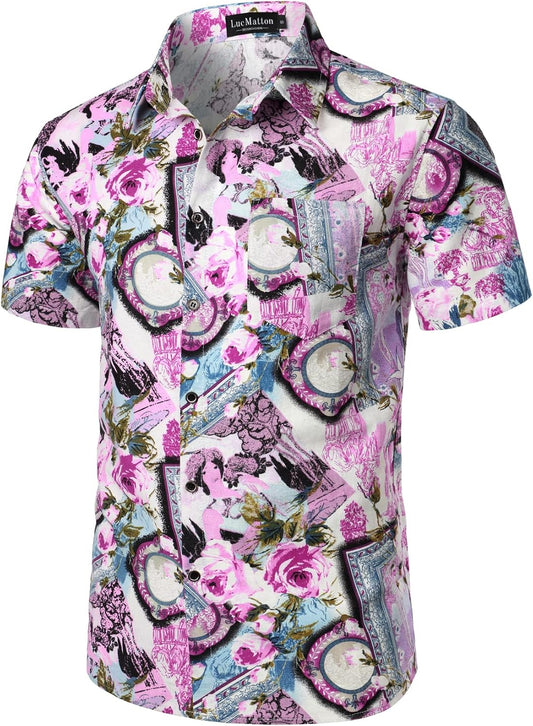 LucMatton Men's Cotton Linen Traditional Pattern Print Short Sleeve Button Down Hawaiian Shirts Pink